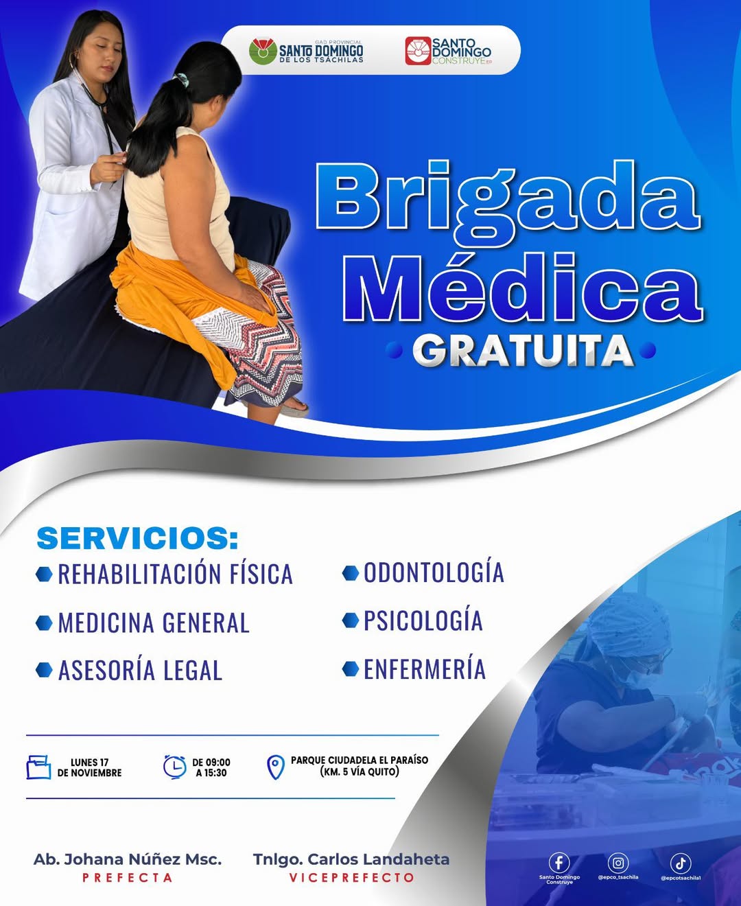 Este lunes estaremos con nuestra brigada médica totalmente gratuita. Habrá diferentes servicios como: Medicina General, Odontología, Psicología, Rehabilitación Física, Enfermería 😉