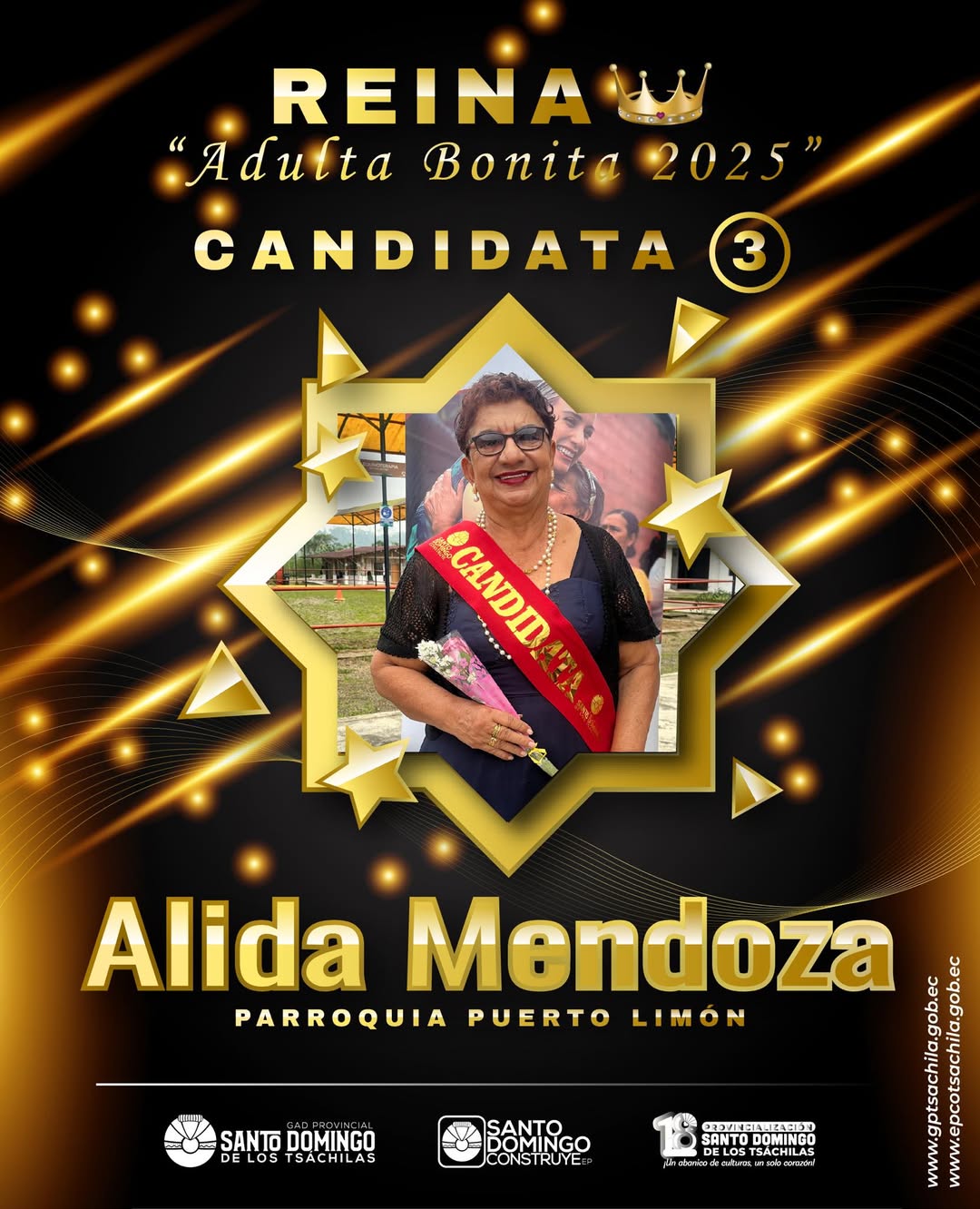 ✅ Con alegría, orgullo y mucho corazón, les presentamos a la candidata #3 a Reina Adulta Bonita 2025 Alida Mendoza, representante de la Parroquia Puerto Limón 💃🏻👑