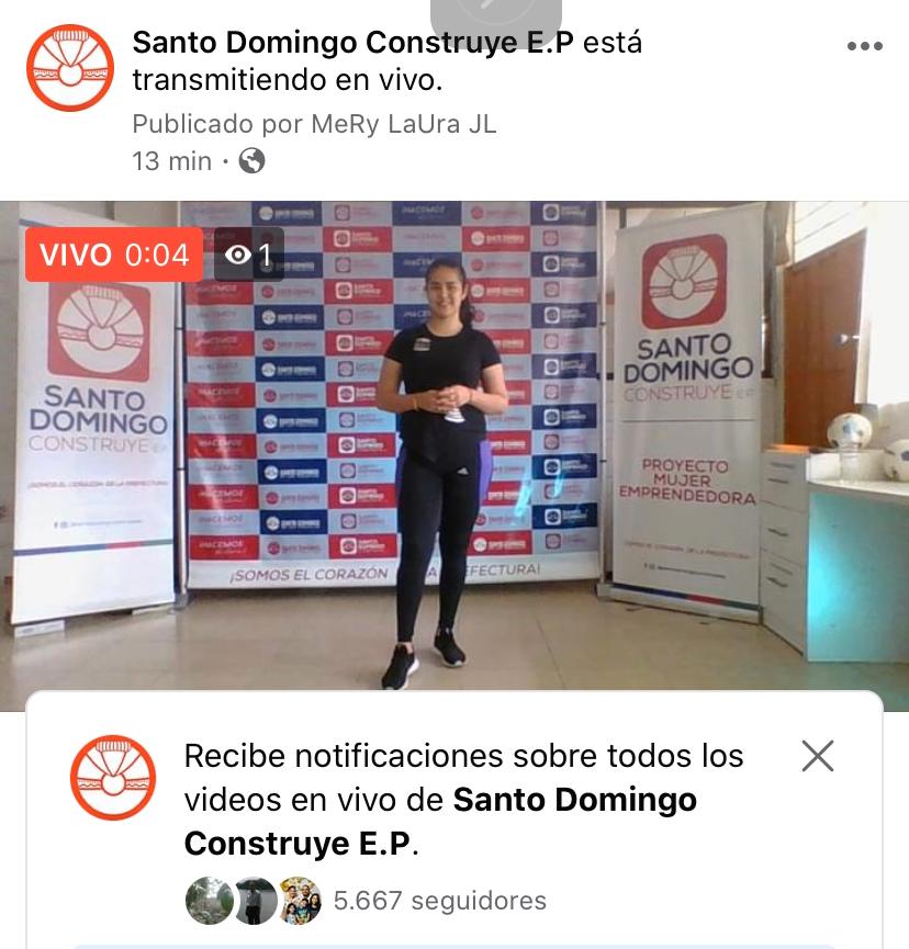A través del Proyecto Mujer Emprendedora, nuestros promotores sociales, Hilery Mazamba y Alexander Reina, imparten aeróbicos y consejos nutricionales, desde las 08:30 hasta las 09:00, de lunes a viernes, bajo el Reto “30 minutos X 30 días”, actividad que se transmite en vivo a través de la página de Facebook de la Empresa Pública Santo Domingo Construye EP.